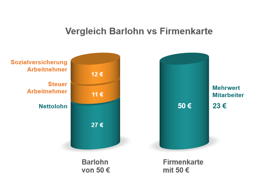 Die Firmenkarte ist eine Einkaufskarte auf Guthabenbasis. Mit Ihrer Firmenkarte können Sie regional Waren und Dienstleistungen bezahlen, jedoch kein Bargeld abheben. Dadurch wird die Firmenkarte steuerlich wie ein Gutschein gewertet und sie gilt somit als Sachbezug. Sachbezüge sind bis maximal 50 Euro im Monat steuer- und sozialversicherungsfrei. Mit den vielfältigen Nutzungsmöglichkeiten der Firmenkarte können Sie Ihr Guthaben an jeder Akzeptanzstelle ausgeben.
